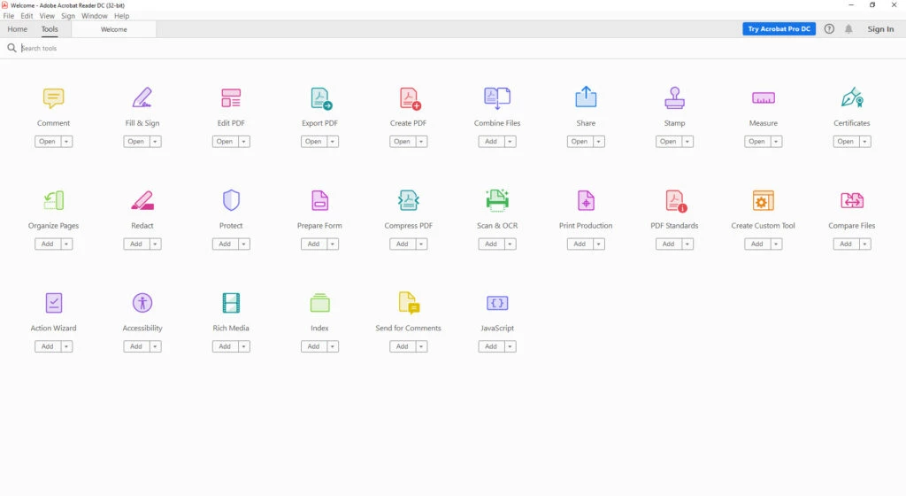 The straightforward and user-friendly interface offers large icons. The simplicity of the tool without any steep learning curve allows the users to view and convert PDFs. You will find the “Tools” tab with a plethora of features, and it is categorized i.e. Create & Edit, Review & Approve, Forms & Signature, and so on. When you tap a category, it will display a drop-down menu to offer different functions i.e. create new files, Protect documents using passwords, add stamps & signatures, etc.